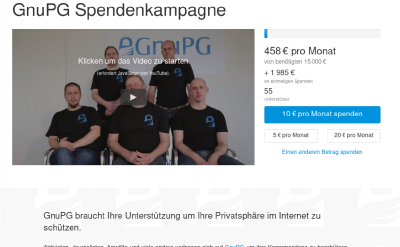Ich unterstütze die Spendenkampagne mit meiner regelmäßigen Spende und würde mich freuen, wenn möglichst viele den Weg auf die Spendenseite des GnuPG Projekts finden um die Programmierer zu unterstützen, die sich um unsere Privatsphäre im Internet kümmern.